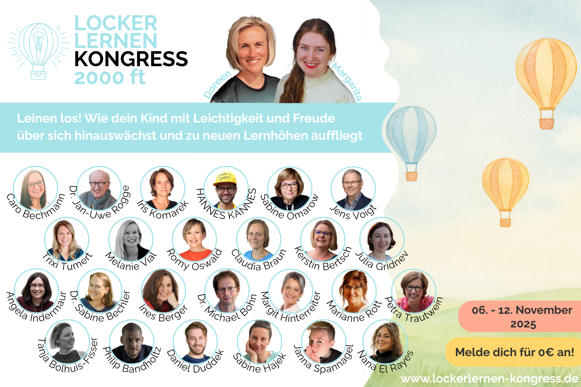Vom 6. – 12. November 2025 findet der LockerLernen Kongress 2000 ft statt – ein kostenfreies Online-Event, das Eltern dabei unterstützt, Kindern neuen Aufwind beim Lernen zu schenken.